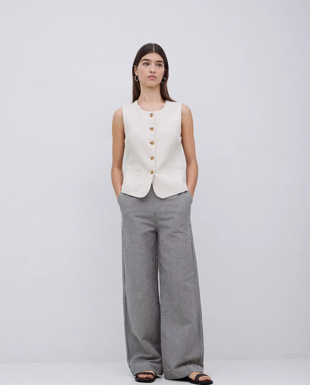 Pantalones diseño recto. Tejido mezcla de lino European Flax y algodón. Estampado de rayas. Cintura elástica en la parte posterior. Dos bolsillos laterales. Dos bolsillos de ribete detrás.