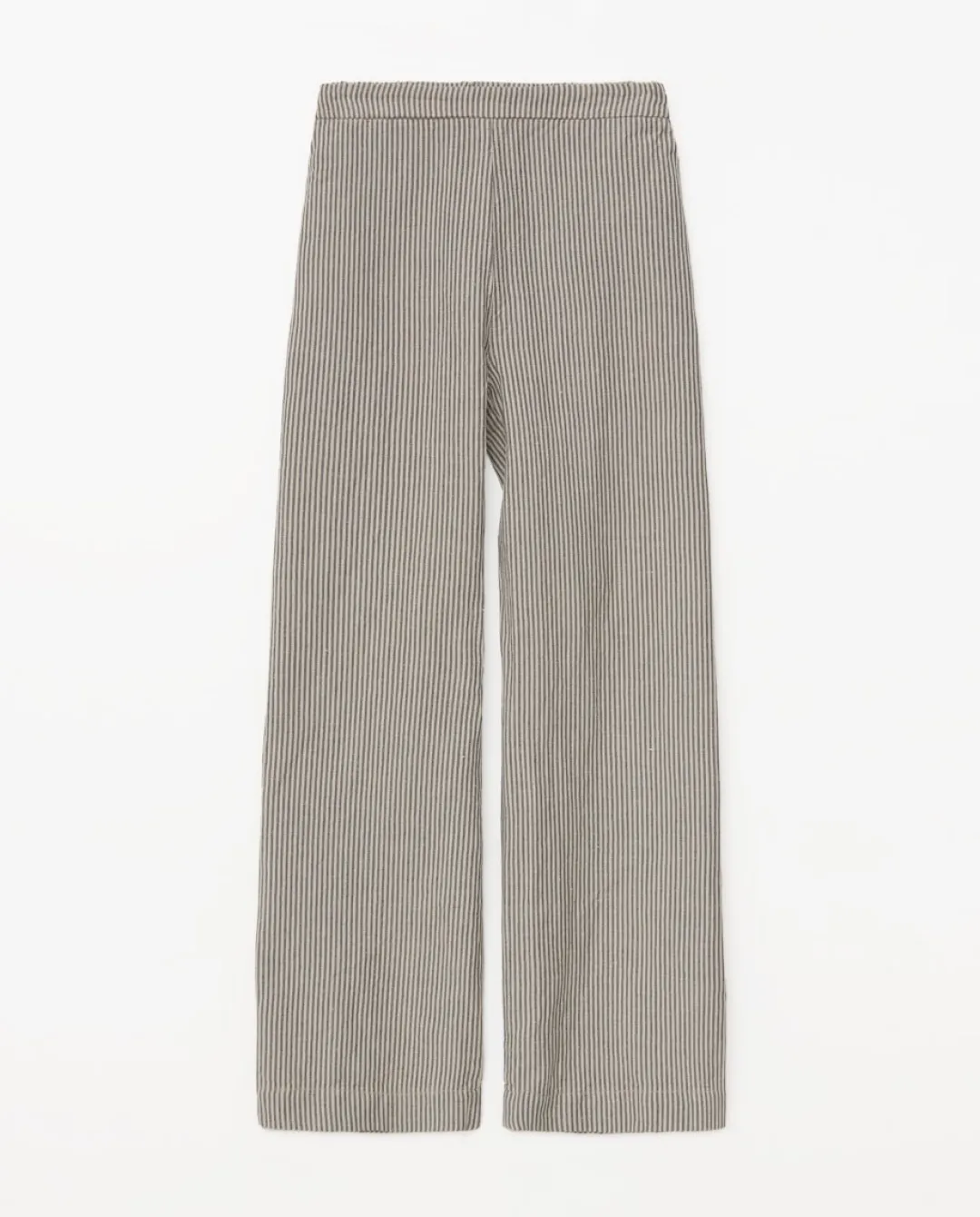 Pantalones diseño recto. Tejido mezcla de lino European Flax y algodón. Estampado de rayas. Cintura elástica en la p…